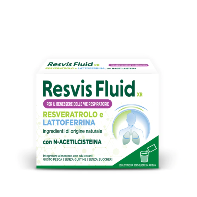 Resvis Fluid XR è un integratore formulato per adulti che grazie alla combinazione di N-acetilcisteina, Resveratrolo e Lattoferrina, è indicato per chi presenta disfunzioni respiratorie acute o croniche con aumentata produzione di muco bronchiale, contribuendo a un'azione antiossidante e adiuvante delle difese naturali.