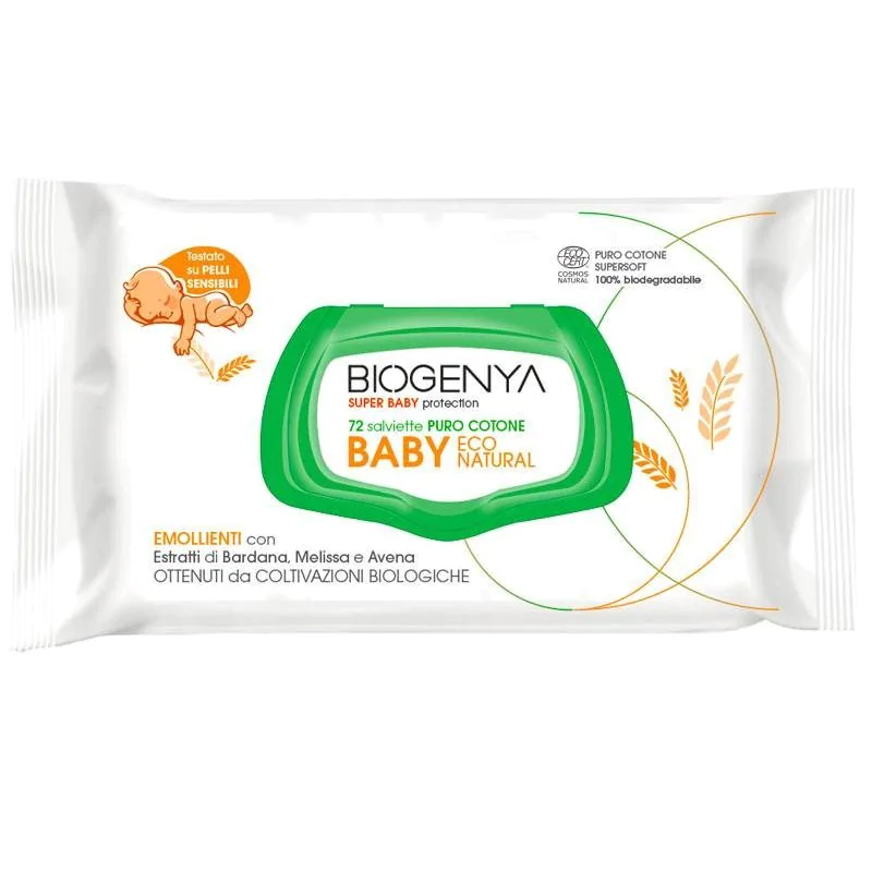 Salviette in puro cotone emollienti con estratti di Bardana, Melissa e Avena ottenuti da coltivazioni biologiche.