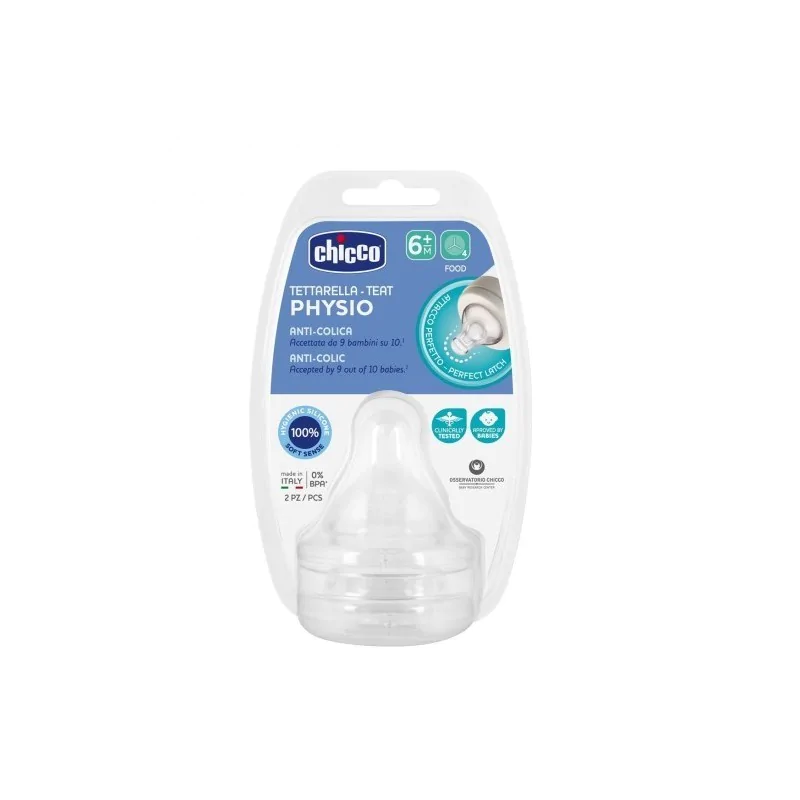La tettarella Physio Chicco in silicone si adatta perfettamente alla bocca del bambino e rispetta il naturale movimento di suzione. Realizzata in silicone extra soffice, la tettarella Chicco Physio simula perfettamente il seno materno, offrendo al bambino una sensazione confortevole che facilita l’accettazione. Grazie alla forma ergonomica la tettarella Physio in silicone di Chicco favorisce il movimento peristaltico della lingua durante la suzione. Le tettarelle Physio si adattano perfettamente a tutti i biberon della serie PERFECT 5, Well-Being e Original Touch.