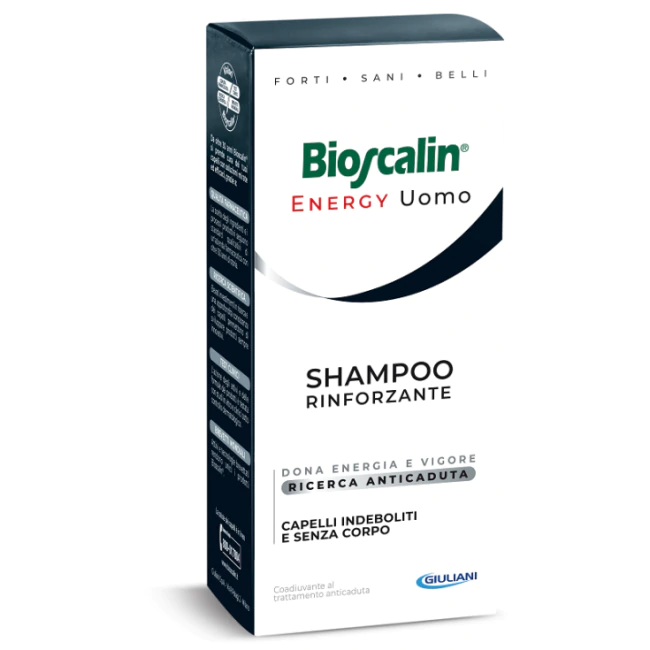 Bioscalin Energy Shampoo Rinforzante è uno shampoo specifico per i capelli dell'uomo, frutto della Ricerca Anticaduta Giuliani, formulato con l'esclusivo brevetto ATP-3 e AJB-Complex, studiato per fornire al capello l'energia necessaria a sostenere le funzioni vitali, contribuendo a contrastare la caduta dei capelli e a restituire corpo e vigore alla chioma.