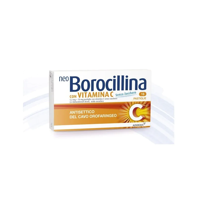 Neo Borocillina pastiglie con vitamina C senza zucchero contiene i principi attivi 2,4 diclorobenzil alcool e acido ascorbico ed appartiene ad una categoria di farmaci detti antisettici (antibatterici) del cavo orofaringeo (bocca e gola), utilizzati per la cura dei sintomi delle malattie infiammatorie della bocca e della gola.