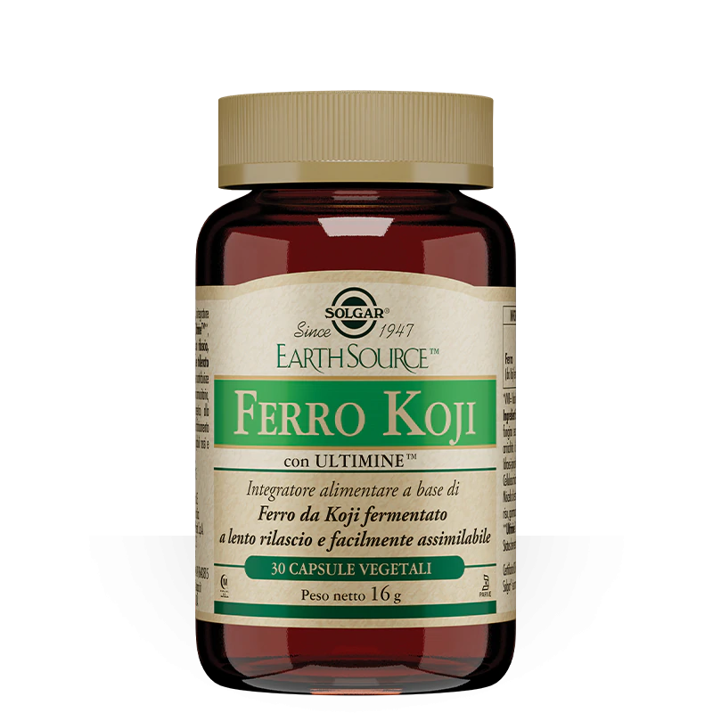 Integratore alimentare a base di Ferro Koji Ultimine, una forma di ferro a lento rilascio, facilmente assimilabile e ben tollerato dal sistema digerente.