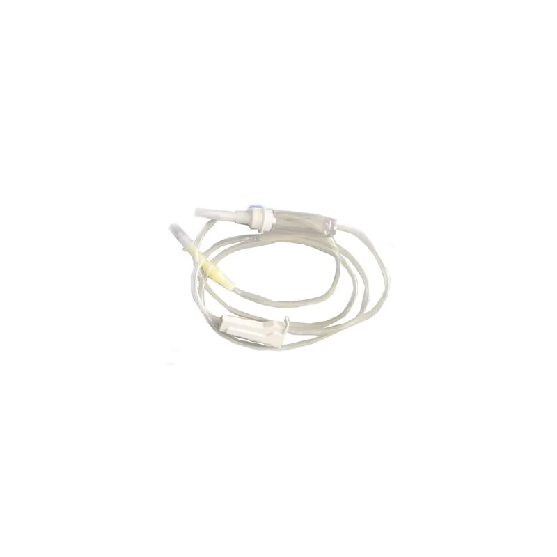 Perforatore in PVC con cappuccio, tappino con filtro antibatterico idrorepellente, camera di gocciolamento con filtro soluzione 15 µm, tubi in PVC, Ø interno: 3 mm, Ø esterno: 4 mm, lunghezza totale: 130 mm, stringi-tubo a roller e raccordo con gommino latex free per eventuali somministrazioni aggiuntive, raccordo a Y con punto di iniezione latex free e paradito.