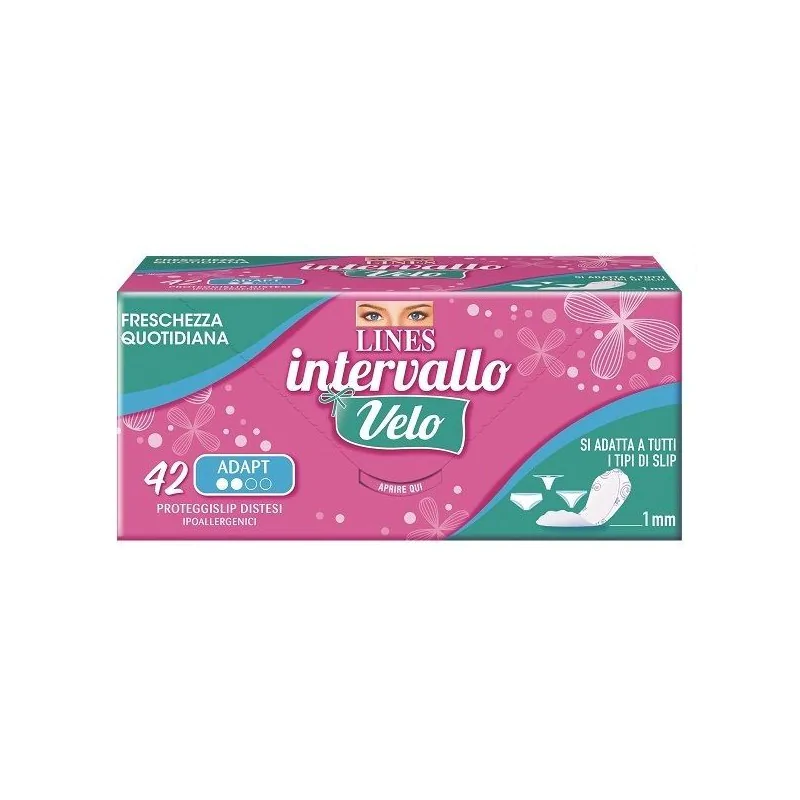 Scoprire la gamma Lines Intervallo Velo, i proteggislip Lines creati per donare una straordinaria sensazione di freschezza durante tutto il giorno, così confortevoli da non sentirli addosso. L'incredibile flessibilità di Lines Intervallo Velo garantisce il massimo del comfort in un solo millimetro di spessore. Grazie alle fibre superassorbenti il prodotto ti assicura, inoltre, la protezione di cui c'è bisogno.
