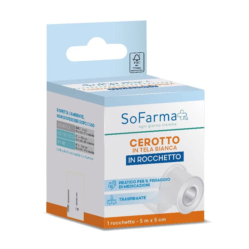 Rocchetto in tela bianca ritagliabile su misura, pratico per il fissaggio di medicazioni.