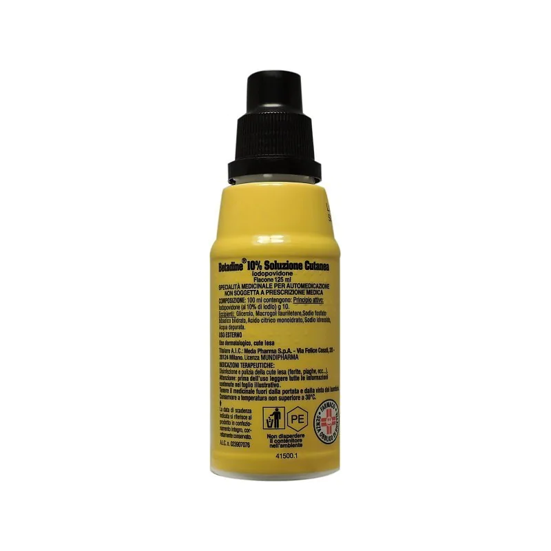 Betadine 10% soluzione cutanea 100 ml contengono: Principio attivo: Iodopovidone (al 10% di iodio) g 10 Per l’elenco completo degli eccipienti, vedere paragrafo 6.1.