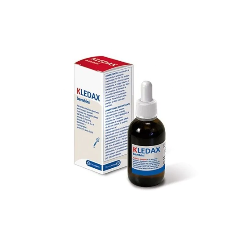 Il prodotto deve essere utilizzato sotto controlo medico, KLEDAX BAMBINI è indicato per il regime alimentare di soggetti affetti da fibrosi cistica, in quanto sopperisce al malassorbimento di vitamine liposolubili che si manifesta nel pazienti con insufficienza pancreatica. E destinato a consumatori entro / 10 anni di età. Non è adatto ad essero utilizzato come unica fonte di nutrimento. Il prodotto non deve essere samministrato per via parentale. Tenere fuori dalla portata e dalla vista del bambini.