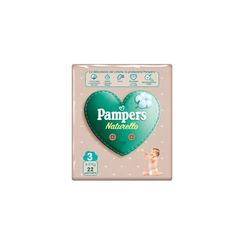 Pampers Naturello, 22 pannolini contenenti cotone e materiali naturali derivanti dalle piante, 0% profumo. Pampers Naturello è un pannolino pensato per garantire al bimbo il massimo della protezione grazie all'aggiunta di ingredienti naturali e rispettosi dell'ambiente.