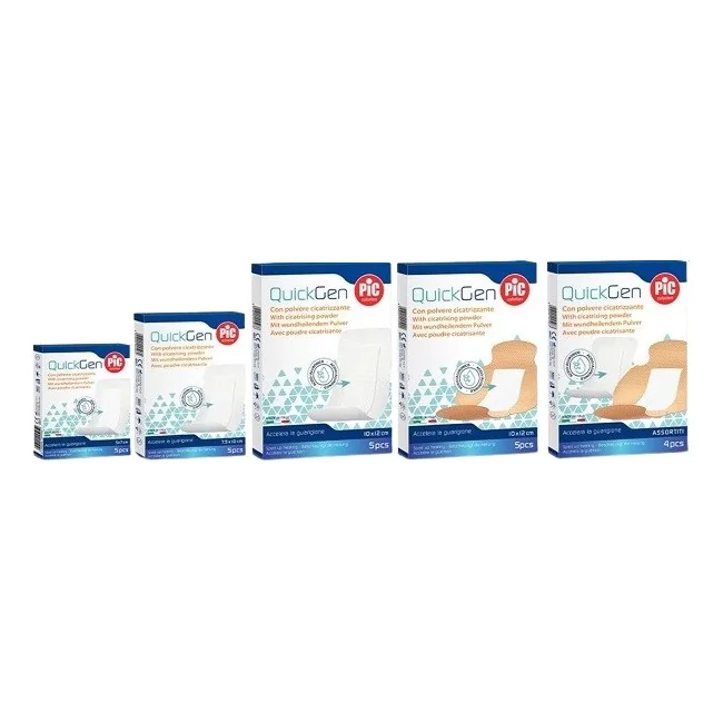 È un cerotto Pic con acido ialuronico che aiuta la cute a rigenerarsi velocemente e quindi a cicatrizzare prima. Protegge la ferita e ne accelera il processo di guarigione grazie all'acido ialuronico contenuto nel tampone. QuickGen è consigliato in caso di escoriazioni, abrasioni e scottature con essudato. L'azione dell'acido ialuronico crea un film protettivo stabile sopra alla ferita che rimane cosi, sempre protetta e ben idratata: queste tre caratteristiche permettono alla pelle di rigenerarsi prima, e alla ferita di guarire velocemente. Il supporto adesivo in tessuto-non tessuto permette alla pelle di respirare, inoltre il formato "a farfalla" per articolazioni consente a gomiti e ginocchia elevata mobilità - grazie al supporto elastico e ai bordi ergonomici. QuickGen è presente in 4 referenze con dimensioni e forme diverse (tra cui la pratica shape a farfalla per articolazioni), piu una versione mix con una referenza per tipo: così puoi prenderti cura di ogni ferita nel modo più adatto.
