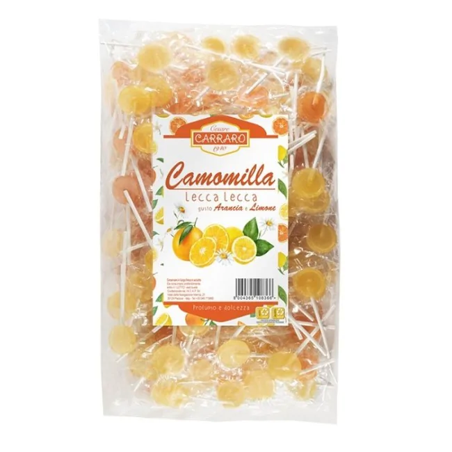 Lecca lecca alla camomilla ai gusti arancia e limone.