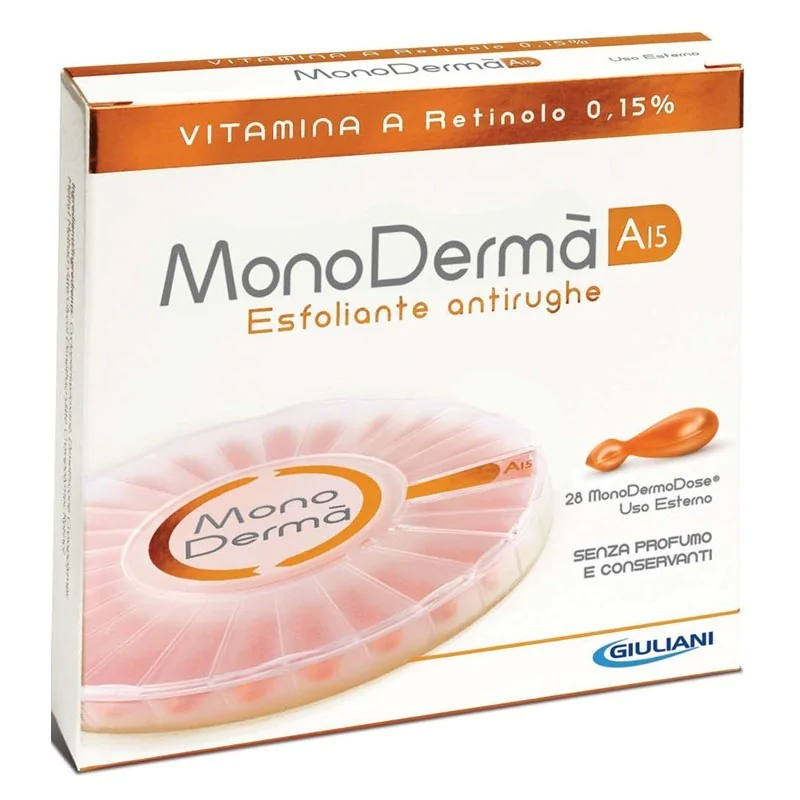 Prodotto dermatologico che contiene retinolo puro (vitamina A) alla concentrazione dello 0,15%. La vitamina A svolge un ruolo fondamentale nella cute in quanto è responsabile del rinnovamento costante del nostro tessuto epiteliale. Il Retinolo è un regolatore naturale del turnover cellulare epidermico, normalizza il processo di formazione dello strato corneo (cheratinizzazione) e protegge le cellule epiteliali. Il Retinolo protegge e mantiene in buono stato la pelle riducendo i fenomeni di invecchiamento cutaneo: oltre a migliorare il processo di rigenerazione cellulare, favorisce la produzione di collagene e svolge un’azione esfoliante e levigante naturale, con un evidente effetto di attenuazione delle rughe e delle discromie cutanee. La MonoDermoDose consente di avere una formula essenziale, sicura e ben tollerata dalla pelle, grazie alla totale assenza di conservanti e profumo. Utile nel trattamento dei segni dell'invecchiamento cutaneo, delle pelli a tendenza acneica e delle anomalie della cheratinizzazione.