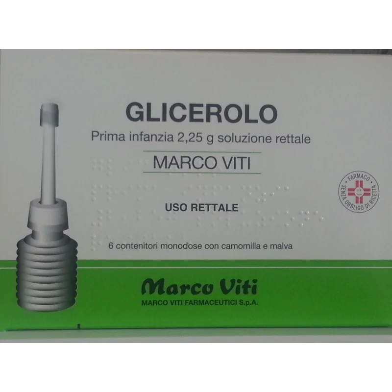 GLICEROLO MARCO VITI prima infanzia 2,25 g soluzione rettale Ogni contenitore monodose contiene: Principio attivo: Glicerolo 2,25 g GLICEROLO MARCO VITI bambini 4,5 g soluzione rettale Ogni contenitore monodose contiene: Principio attivo: Glicerolo 4,5 g GLICEROLO MARCO VITI adulti 6,75 g soluzione rettale Ogni contenitore monodose contiene: Principio attivo: Glicerolo 6,75 g Per l’elenco completo degli eccipienti vedere paragrafo 6.1.