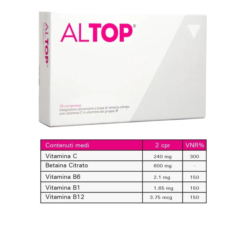 Integratore a base di Betaina citrato, Vitamine B1, B6, B12 e Vitamina C. ALTOP è utile per apportare una quota supplementare di tali componenti...