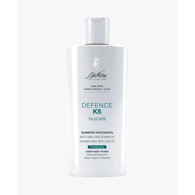 BioNike Defence KS è uno shampoo anticaduta specificamente formulato per capelli fragili e diradati che, grazie alla sua azione delicata e ai suoi ingredienti attivi come la Pro-vitamina B5, la Niacina e la Biotina, aiuta a migliorare le condizioni del cuoio capelluto, favorendo il microcircolo e la vitalità del bulbo capillare.